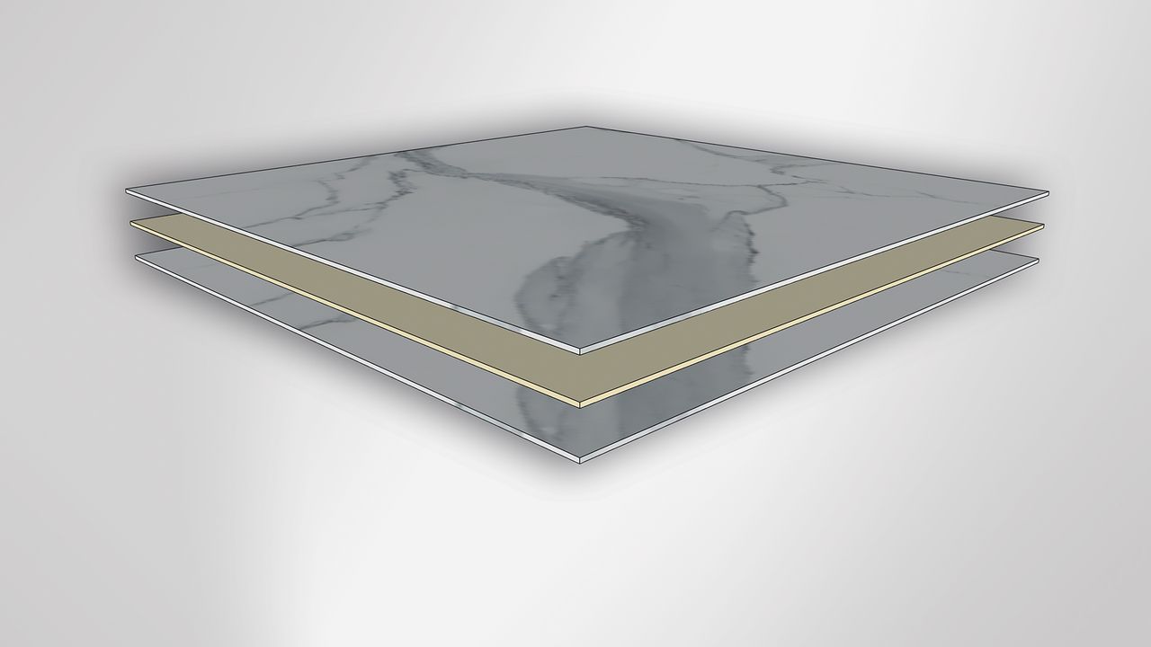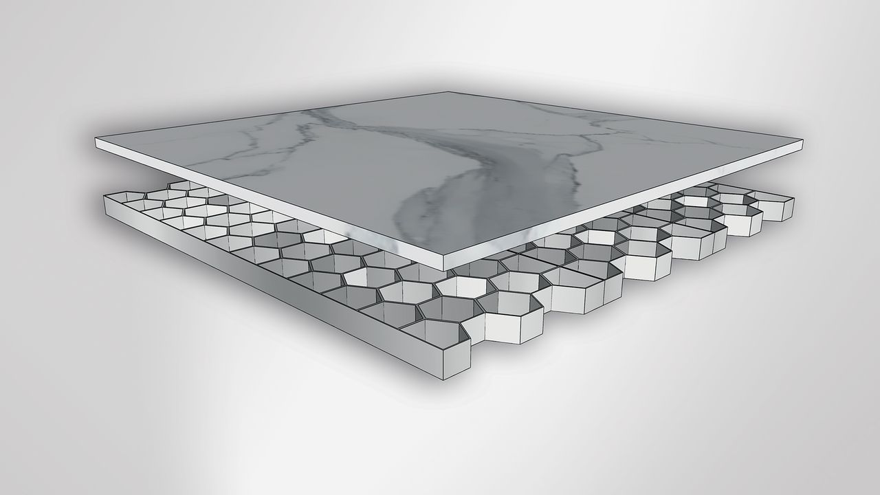 Utilizzo di pannelli compositi leggeri, selezionati in base all’applicazione e alle esigenze progettuali specifiche, con spessori complessivi (pietra naturale più pannello) da 10 a 30 mm, secondo richiesta del cliente.